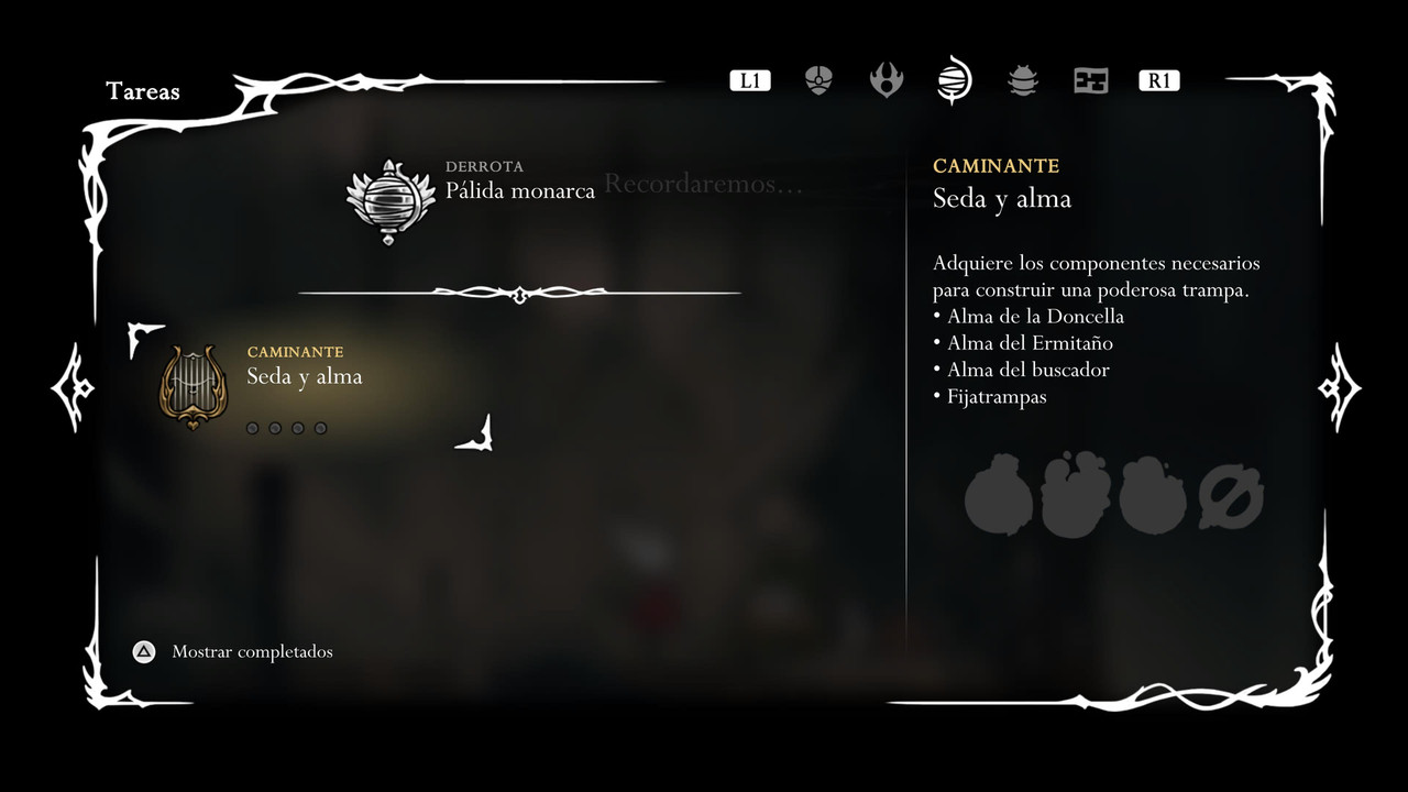 - Sidequests pendientes: 'Seda y Alma' (Alma del buscador y fijatrampas).