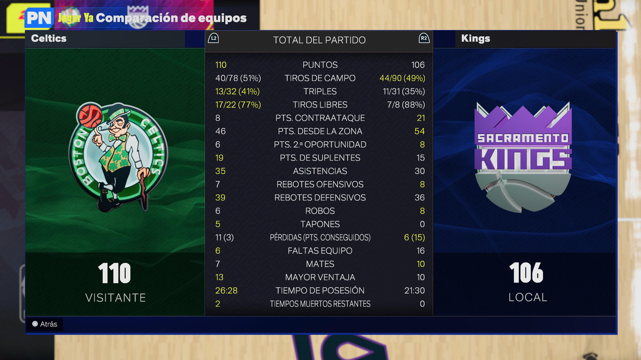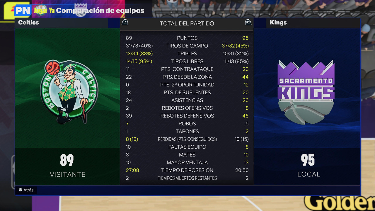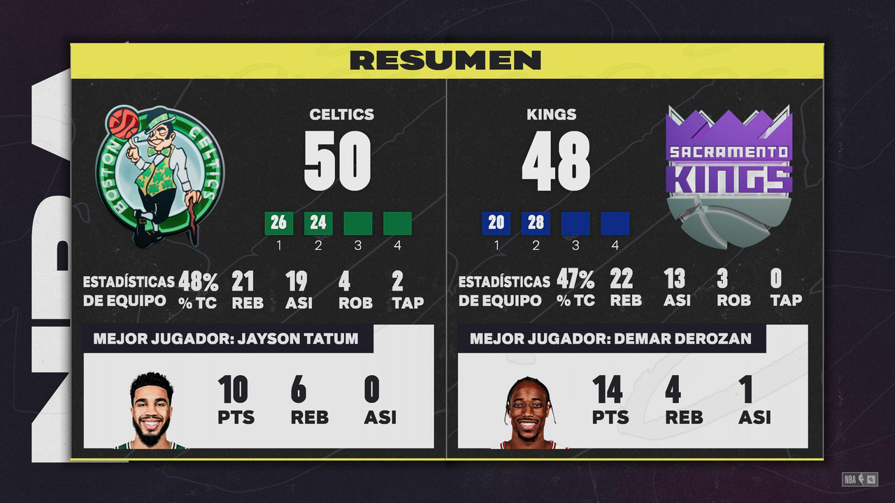 Derrota honrosa de los verdes en su primer partido "oficial" de pretemporada en nivel All-star, ante unos Kings que sorprendieron gratamente gracias al trío DeRozan-Lavine-Sabonls. Boston empezó mandando con rentas de +10, pero el conjunto local logró remontar con un DeMar explosivo en sus penetraciones. A medio minuto del final y con 93-89, Tatum falló un triple liberado que podría haber cambiado el signo del partido, una auténtica lástima.