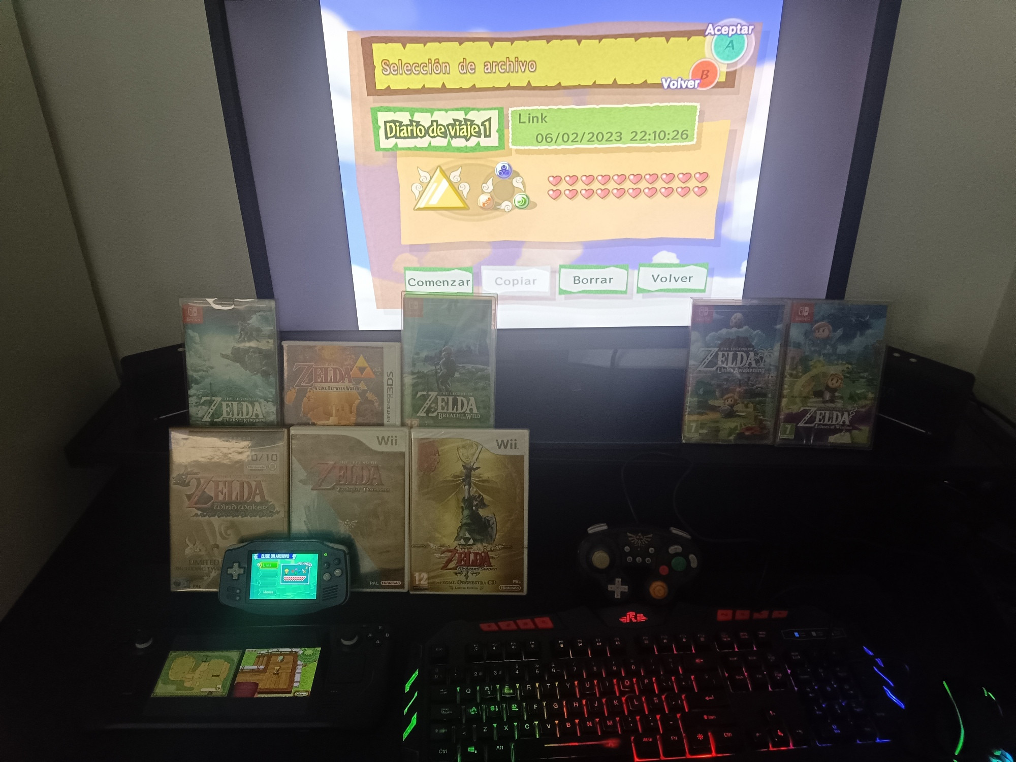 La tengo bastante gorda, la colección de Zelda digo, porque tengo todas las entregas de la saga, aunque las dos primeras en el recopilatorio de GC, no por separado, el Ocarina of Time lo tengo repetido todas las veces posibles (3), igual que Majora's, pero todos los demás solo los tengo una vez, en general en su versión original, no tengo ningún remaster ni port, salvo Link's Awakening, que tengo el DX y el remake. También tengo varios artículos de coleccionista, entre los que se encuentra un espejo de la trifuerza y algunos amiibo, pero nada del otro jueves, lo más importante para mí era tener jugable toda la saga, objetivo que planteé en 2020 y finalicé en 2022, creo recordar.
